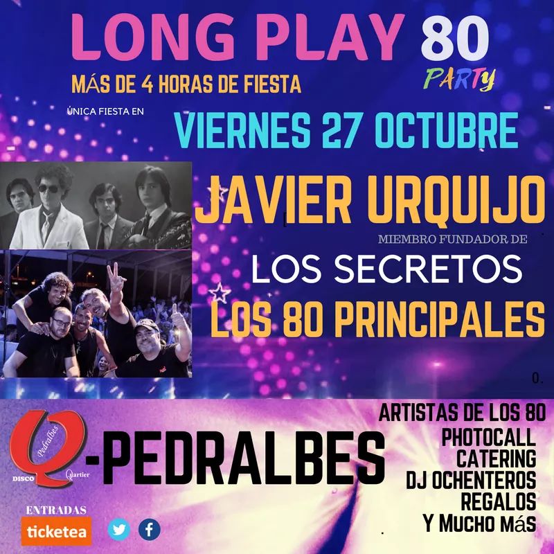 Gran fiesta «LONG PLAY 80» con la actuación del miembro fundador de la mítica banda «LOS SECRETOS» .No te lo pierdas el próximo viernes 27 de Octubre a partir de las 23.30 en disco Q Pedralbes.